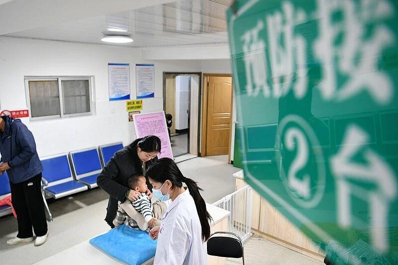 10月25日,安徽省阜阳市阜南县疾病预防控制中心医务人员在为幼童开展秋冬季流感疫苗预防接种。